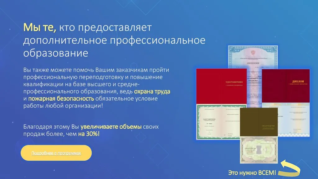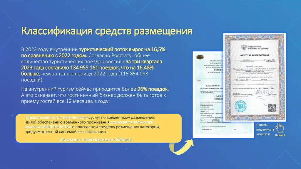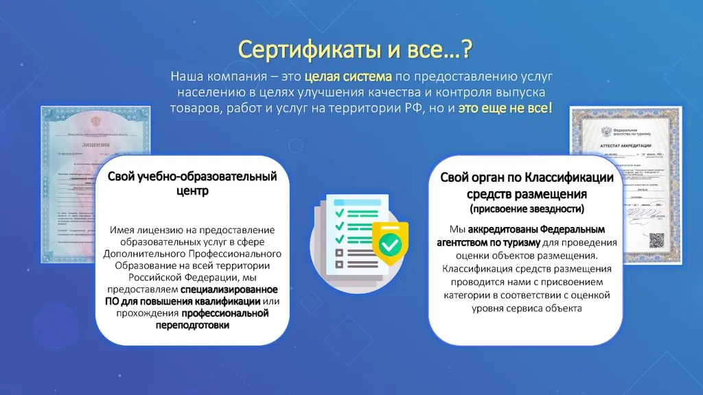 Мы одними из первых запустили услугу по Классификации средств размещения в соответствии с Постановлением Правительства РФ №1860. 🚀 Также наши франчайзи смогут предоставлять клиентам различные виды Дополнительного Профессионального Образования (ДПО): профессиональную переподготовку и повышение квалификации. 🎓