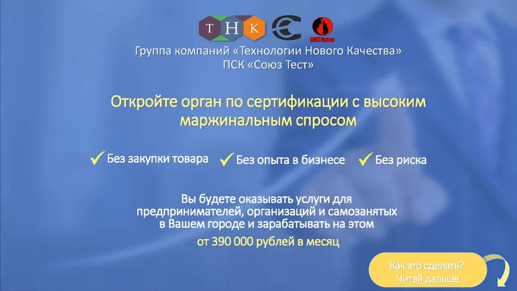 Франшиза ООО «Технологии Нового Качества» — это возможность быстрого и высокодоходного старта 🚀 в вашем городе, став частью органа по сертификации!