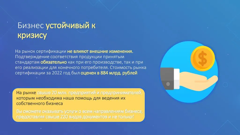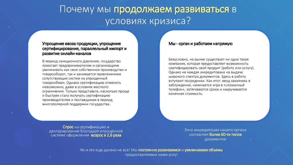 С 2015 года наша компания помогает предпринимателям и крупным организациям в оформлении разрешительной документации в кратчайшие сроки. 📜 Подтверждение соответствия — обязательная процедура для большинства видов продукции, товаров и услуг, что обеспечивает постоянный спрос на нашу деятельность.