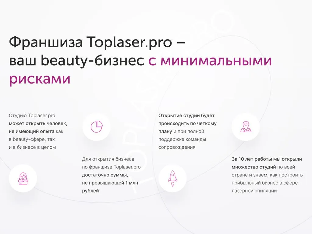 Сегодня Top Laser Pro — это одна из лучших франшиз студий лазерной эпиляции и команда экспертов с многолетним опытом в области косметологии, продаж оборудования и развития бизнеса по франшизе. Присоединяйтесь к нам — мы научим вас всему 💼!