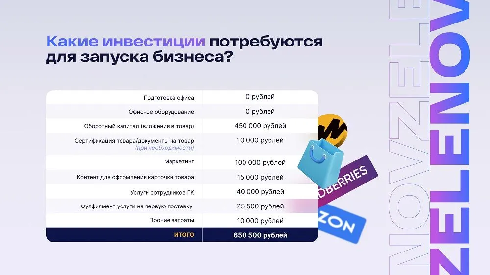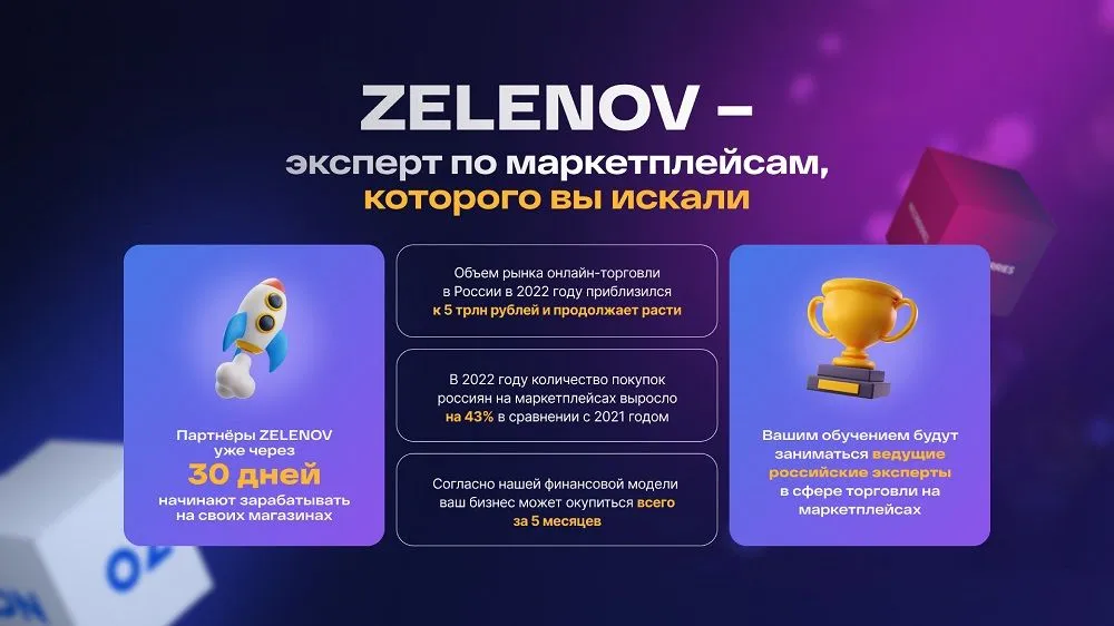 Zelenov – это компания, которая помогает людям быстро и с минимальными рисками запустить бизнес на маркетплейсах 🌍 и управлять им из любой точки мира.