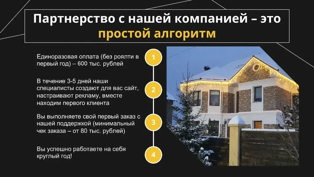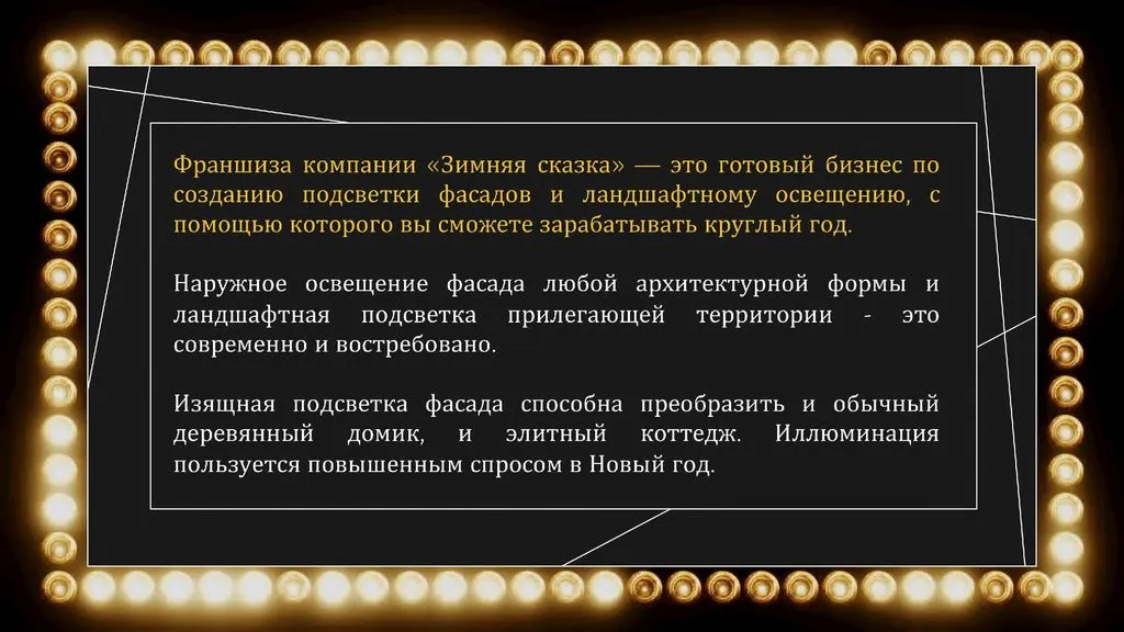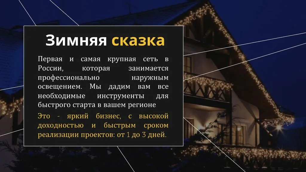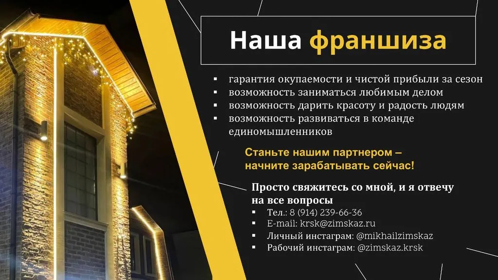 Франшиза «Зимняя Сказка» – это готовый бизнес по созданию подсветки фасадов и ландшафтного освещения, который приносит чистую прибыль до 250 000 рублей ежемесячно 💰.