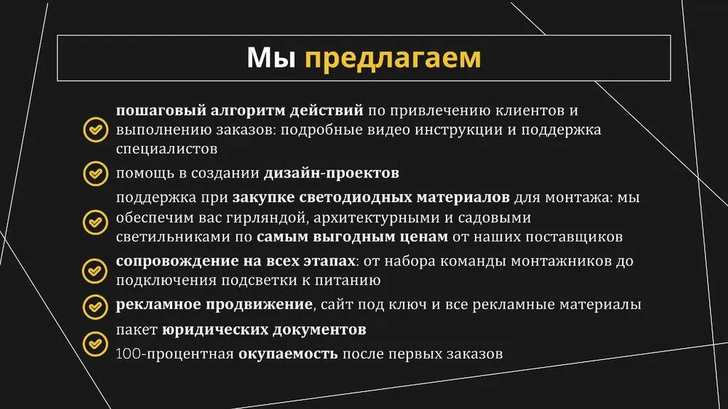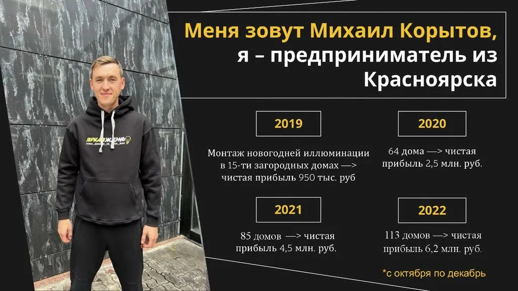 С 2019 года наша команда работает с частными и государственными заказчиками, а также бизнесом в Красноярске. С 2020 года мы активно развиваемся в других регионах России по франшизе, 🌍 и уже более 15 партнёров из разных городов от Москвы до Хабаровска стали частью нашей команды. Мы – первая крупная федеральная сеть в сфере декоративного освещения в России, и не собираемся останавливаться! 🚀